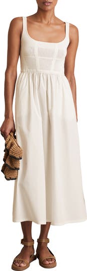 A crisp cotton skirt punctuates this sleeveless maxi contrasted with an open-stitch bodice and finished with a leg-baring side slit.