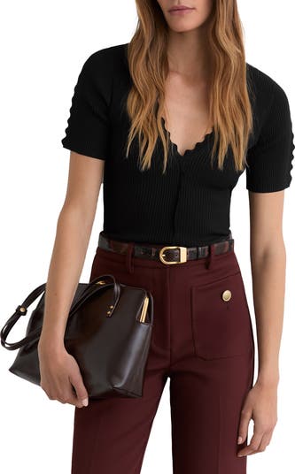 Scallops on the V-neck and sleeves elevate this trim and versatile rib-knit top.
