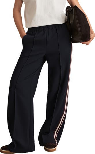 An elastic-eased waist and side stripes lend a breezy feel to refreshingly versatile pants designed in a loose, flowy fit.
