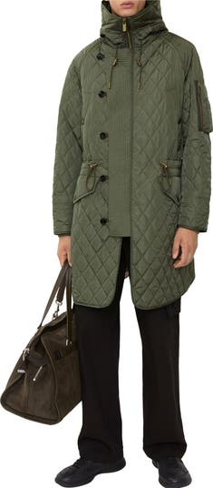 A Burberry parka from the Spring/Summer 2018 collection, reissued in a limited edition of 500. Staying true to the original khaki green nylon outer, the quilted coat is updated with a Burberry Check cotton twill lining in signature sand beige. Cut to a relaxed fit with a drawcord hood and waist to adjust the shape.||Button and two-way zip closure|Drawcord hood and waist|Chest press-stud welt pockets, side press-stud flap pockets, sleeve zip and pen pocket|Storm cuffs|Burberry Check lining|Comes with a garment bag
