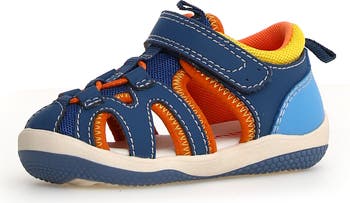A classic fisherman silhouette with a closed toe protects little feet from stubs in a water-friendly sandal outfitted with durable overlays and grounded by a flexible traction sole.