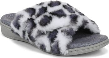A cushy footbed provides endless support in a faux-fur slide sandal with adjustable straps and a textured outsole.