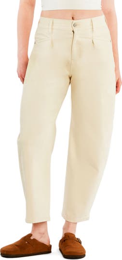Trouser-inspired details bring a fresh look to these fashion-forward barrel jeans that curve out at the knees and end in cropped hems.