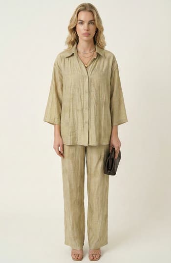 This relaxed two-piece set features a fluid button-front shirt paired with easy, straight-leg pants for an effortlessly polished look. The softly textured fabric drapes naturally, creating a lightweight feel with subtle visual depth throughout the set. An elastic drawstring waistband adds comfort and flexibility while maintaining a clean, tailored appearance. Wear the pieces together for a refined, coordinated outfit or style them separately for versatile everyday dressing.