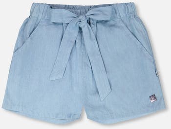 Our blue chambray shorts are a breezy essential with a chic twist. These bottoms feature an elastic waistband with a self-tie belt, slant pockets, and a relaxed fit that makes them perfect for everyday wear. Light and flowy in chambray, they’re ideal for girls, easy to pair with tops from our "Blue Horizon" collection.