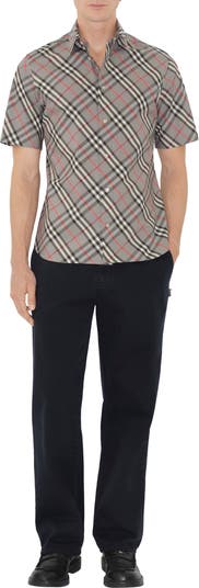 A short-sleeved cotton shirt woven with the Burberry Check in a seasonal wine red colourway. The style is cut to a relaxed fit.||Button closure|Point collar|Curved hem