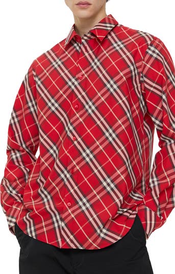 A long-sleeved shirt made from soft cotton poplin, tailored to a relaxed fit. The classic button-up style is woven with the iconic Burberry Check in a seasonal crayon red – created as part of our Year of the Horse capsule.||Button closure|Point collar|Single-button cuffs|Curved hem