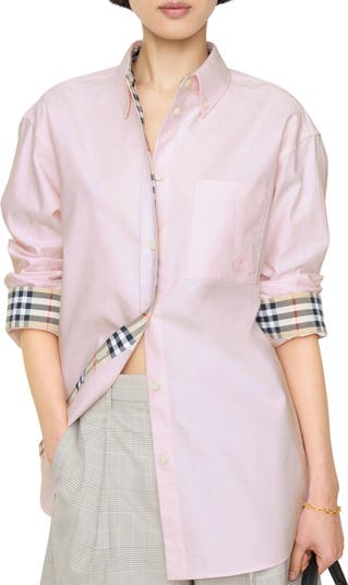 A classic cotton Oxford shirt tailored to a relaxed fit. The style is embroidered with a tonal Knight stamp – an archival motif first seen on Burberry bags in the 1980s. Burberry Check lines the collar, placket and cuffs in signature sand beige.