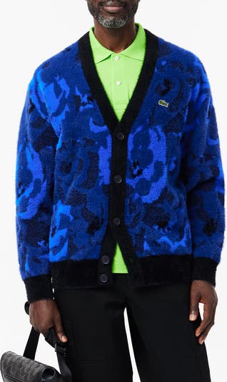 Intarsia-knit blooms decorate a crocodile-branded cardigan designed for classy comfort in a relaxed fit.