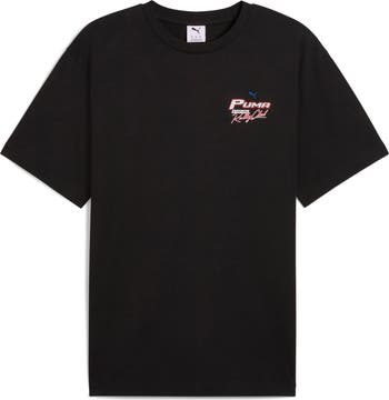 A partial-rubber graphic lays down the tread on this T-shirt cut from soft, breathable cotton to rev up your downtime look.