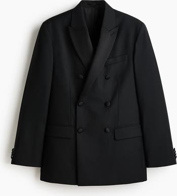 Double-breasted tuxedo jacket in a wool-blend weave with satin details. Peak lapels with a decorative buttonhole, a chest pocket, jetted front pockets with a flap, and two inner pockets. Decorative buttons at the cuffs and a double back vent. Relaxed fit for a casual but not oversized silhouette. Lined.