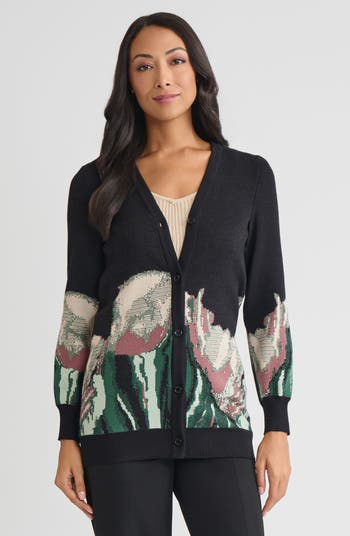 The Relaxed Floral Jacquard Knit Cardigan brings an artful touch to timeless knitwear. Designed with a softly tailored fit, it features a painterly floral jacquard motif in rich seasonal tones for effortless elegance. Finished with a button front and ribbed trim, this cardigan transitions seamlessly from workday layering to evening sophistication.