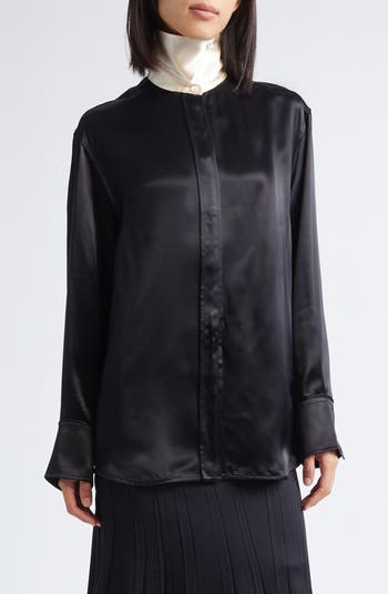 Engineered to balance structure with movement, this runway-featured satin shirt sets a crisp contrast point collar with a hidden‑button closure against a body that drapes like liquid. The relaxed silhouette slips past the frame and ends in a curved hem that underscores the generous cut. A rich sheen catches every angle for a quiet yet unmistakable glow.