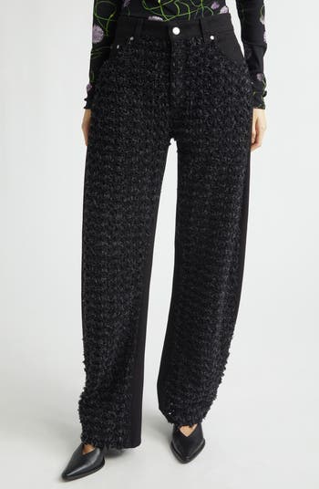 Savile Row–trained McCartney finds harmony in duality with these distinctive black-denim jeans fronted with a fuzzy open-weave bouclé and cut with a mid waist and rounded barrel leg.