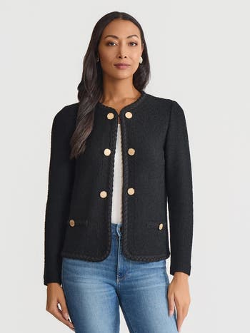Uplevel the transitional wardrobe with our Relaxed Lightweight Soft Tweed Knit Jacket, a seasonless staple that offers a refreshed and refined finish. Its classic tweed design exudes high sophistication with three color options emboldened by large novelty buttons and elegant braided trim. Though a relaxed fit jacket, this textural layer flawlessly pulls together a structured look when paired with chic separates in complementary tones.