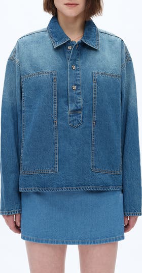 Featuring a contemporary boxy silhouette and superdeep patch pockets, this nonstretch denim popover shirt is done up in a cool ombré fade to complement your laid-back lifestyle.