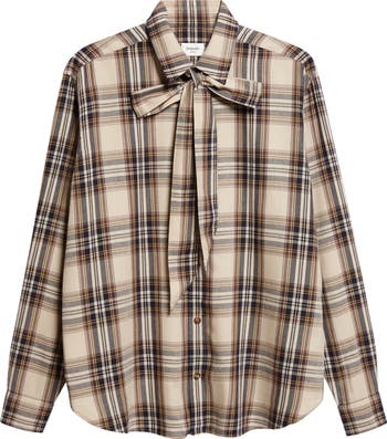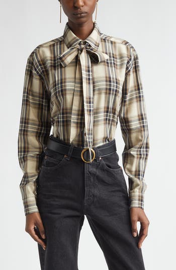 Anthony Vaccarello reinterprets YSL’s popular pussy‑bow styles of the '70s with this relaxed plaid button-up shirt featuring long ties that can be fashioned in a prim bow or left undone for a more carefree look.