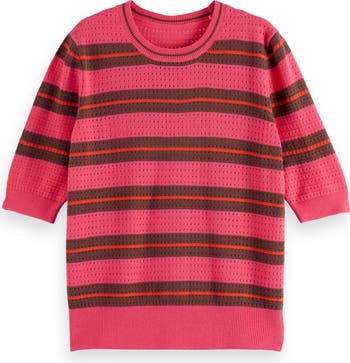 Pointelle stitching lends an airy look and feel to this transitional sweater framed by short sleeves.