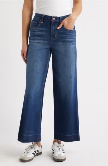 Bring a vintage vibe to your casual looks with stretchy wide-leg jeans featuring released, ankle-grazing hems and a faded dark wash.