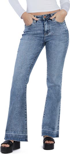 Released hems bring retro style to mid-rise flared jeans perfect for running errands or meeting friends.