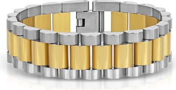 The definition of industrial chic, this statement two-tone bracelet is made from a mix of silvertone and 14-karat-gold-plated stainless steel.