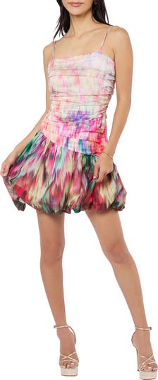 A mesmerizing print adds vivid charm to this sleeveless mini topped with a ruched close-fitting bodice and a fun, bubbly skirt.