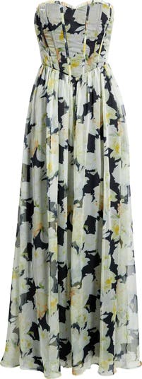 This blossom-tossed chiffon maxi dress perfect for your next event is fashioned with a corseted sweetheart bodice and a full gathered skirt that sways beautifully as you move.