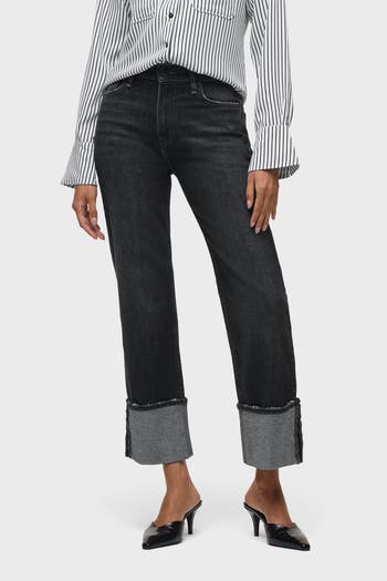 Our Remi High-Rise Straight Ankle Jean with Wide Cuff in Washed Black is cut with a flattering high rise and relaxed leg|Made of premium comfort stretch denim in a washed black shade this pair is finished with a wide 5" cuff and clean finished hem|