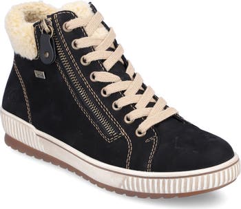 A faux-shearling collar brings cozy appeal to a high-top sneaker made with shock-absorbing construction and a side zip for easy on and off.