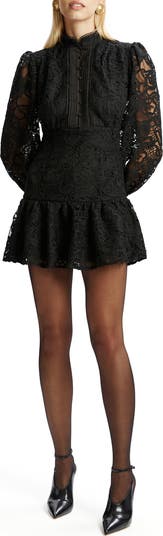 Rich lacy embroidery romances this leggy-length dress framed by puff shoulders and finished with a flouncy frilled hem.