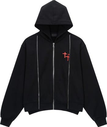 A double-layer zip design adds a modern, street-style edge to this cotton hoodie sporting a triple cross motif on the chest and a planetary logo on the back.