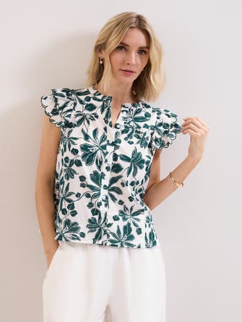 Airy blouse with flutter sleeves, gentle gathers and a neat button front, offering graceful movement for sunlit days.
