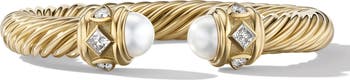 Cultured South Sea white pearls gleam along the endcaps of this spiraling cuff bracelet with diamonds for added glamour.