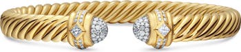 Pavé diamonds gleam along the endcaps of this 18-karat gold cuff bracelet with spiral detailing on a flexible silhouette.