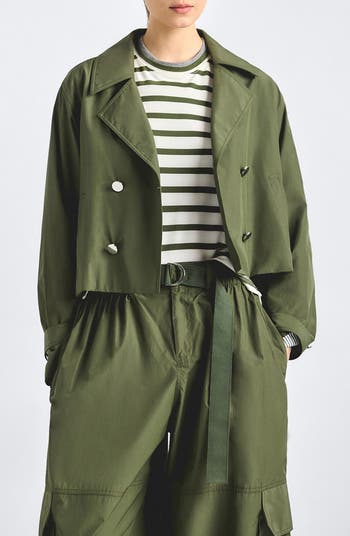 A belted waist and cuffs shape the silhouette of this modern trench updated in a cropped silhouette and fronted with high-shine double-breasted buttons.