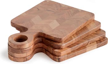 - Matching set of 4 each sized at 12 x 8 x 2. 5 inches. Made from acacia wood.