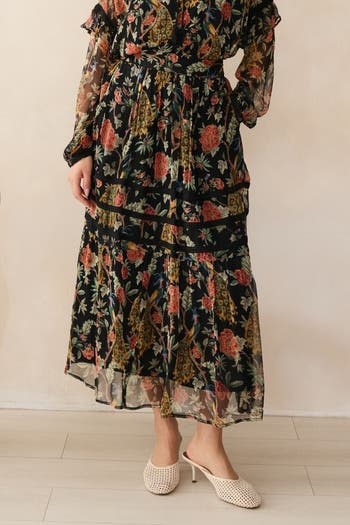 Graceful floral skirt crafted in a flattering midi length with a fluid silhouette. Featuring an all-over botanical print and comfortable waistband, this skirt offers feminine movement and is ideal for versatile styling.