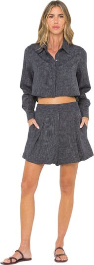 Relaxed-fit cropped blouse with tie-back detail and cuffed sleeves. Made in the USA with soft linen blend by JBQ.
