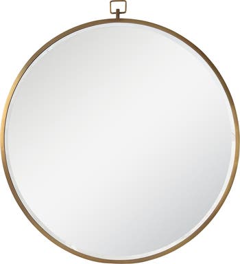 A perfectly circular wall mirror floats in a frame of brasstone iron topped with a decorative hook to bring modern polish and retro detailing to any décor.
