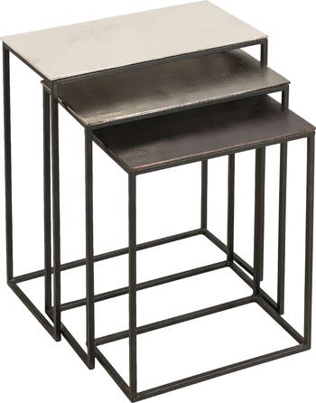 Traditional by design with a contemporary feel, a set of three sleek nesting tables glows from metallic metal.