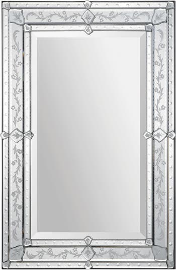 Etched floral patterns create an ornate frame around this sleek, beveled mirror.