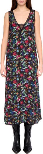 Lacy trim furthers the enchanting style of this airy sleeveless dress in a vibrant floral print.