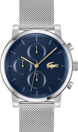 Functional subdials and a navy dial bring sporty refinement to a chronograph watch marked by willowy stick indexes and a signature croc logo.