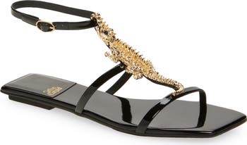 A textured crocodile delivers a bite of sharp shine to this strappy sandal that makes a scene at the foot of your ensembles.