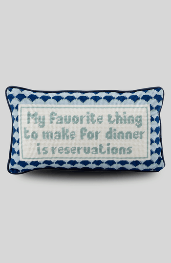 Make a statement with this charming-meets-chic needlepoint pillow. Embroidered and backed in luxe blue velvet, we've revived this Southern staple with sayings that are sure to get a smile. They are guaranteed to spark joy and make the perfect gift! Dare to mix with our scalloped linen, contrast trim velvet, ruffled block print, and needlepoint pillows for an insta-worthy pillow pile.