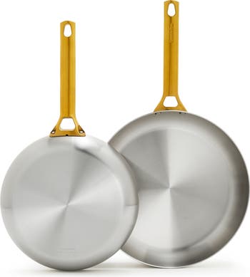 Upgrade your kitchen equipment with two professional-grade frying pans made with stylish gold handles and durable stainless steel that's designed to stand up to daily use.