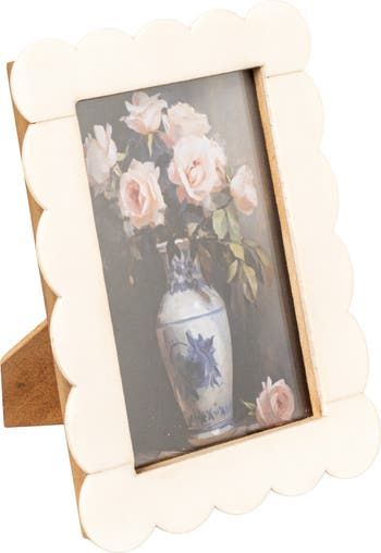 This Resin and Wood Scalloped Photo Frame in a pristine white finish is perfect for farmhouse, French country, and transitional decor. Made of durable resin and wood, it holds a 4" x 6" photo, adding a touch of elegance to any space. Measuring 5.5 inches in length and 7.5 inches in height, this frame is ideal for displaying cherished memories. The scalloped design adds a unique touch to the frame, making it a standout piece in any room. Its versatile color and style make it easy to incorporate into various design aesthetics. Whether placed on a mantel, shelf, or desk, this photo frame will effortlessly enhance the look of any home.