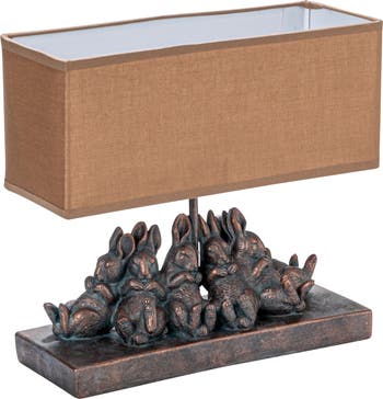 - A whimsical table lamp that features a bronze-finish resin base of lounging rabbits and a linen shade