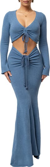 Front ruching amplifies the flirty style of this matching crop top and trumpet skirt made from soft and stretchy knit fabric.