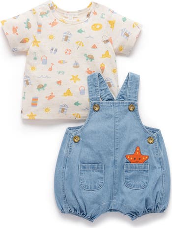 Our Resort Overall Set is the perfect 2 piece for summer play. Featuring our soft denim overalls with peekaboo starfish applique on the pocket, and fun printed tee for layering. Made from 100% Cotton for a soft and breathable set. Wear together, or mix and match with your other items.